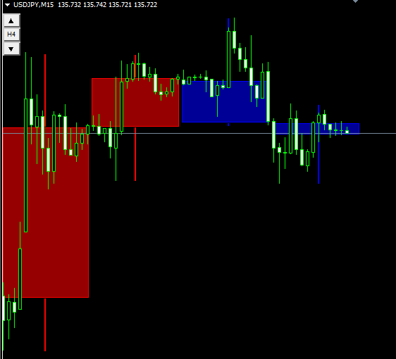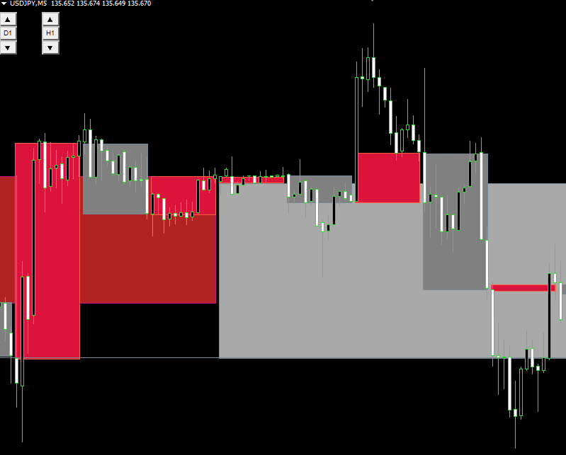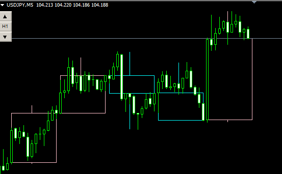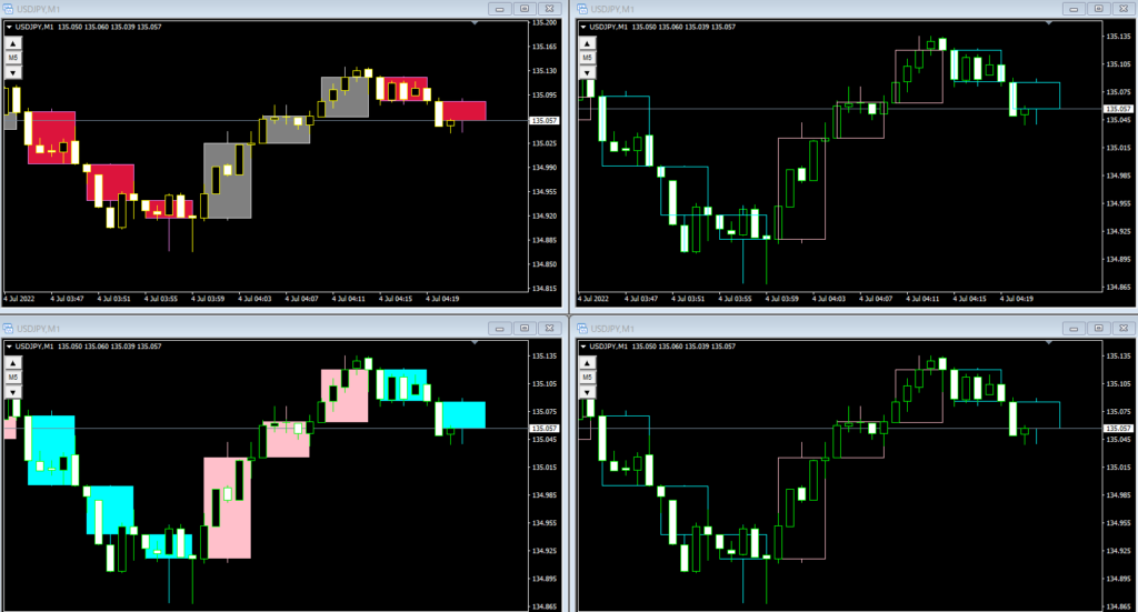 5分足に1時間のローソク足、1時間に日足のローソク足、4時間に週足のローソク足のように、チャートに上位足を表示する事が出来ます。
