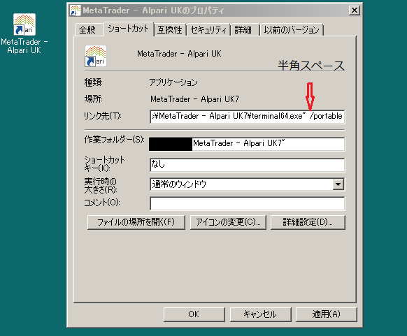 ~terminal(64).exe"の後ろに(半角スペース) /portable を入力してOKボタンを押します。